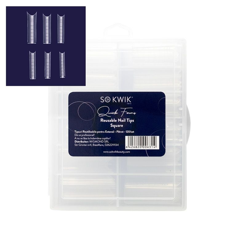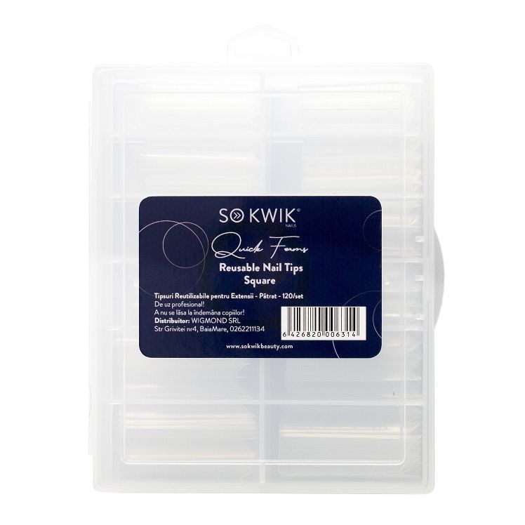 Noile tips-uri reutilizabile Quick Forms permit realizarea extensiilor intr-un mod foarte simplu, eliminand dificultatile cauzate de montarea sablonului. Aceste forme sunt ideale pentru realizarea extensiilor, respectiv pentru corectarea arhitecturii unghiei la intretinere. Quick Forms sunt realizate din plastic flexibil si pot fi reutilizate. Setul contine 120 tips-uri disponibile in 12 dimensiuni, astfel incat sa gasim marimea potrivita pentru fiecare unghie naturala. (Se recomanda ca tipsul utilizat sa fie cel putin la fel de lat ca si patul unghial)
