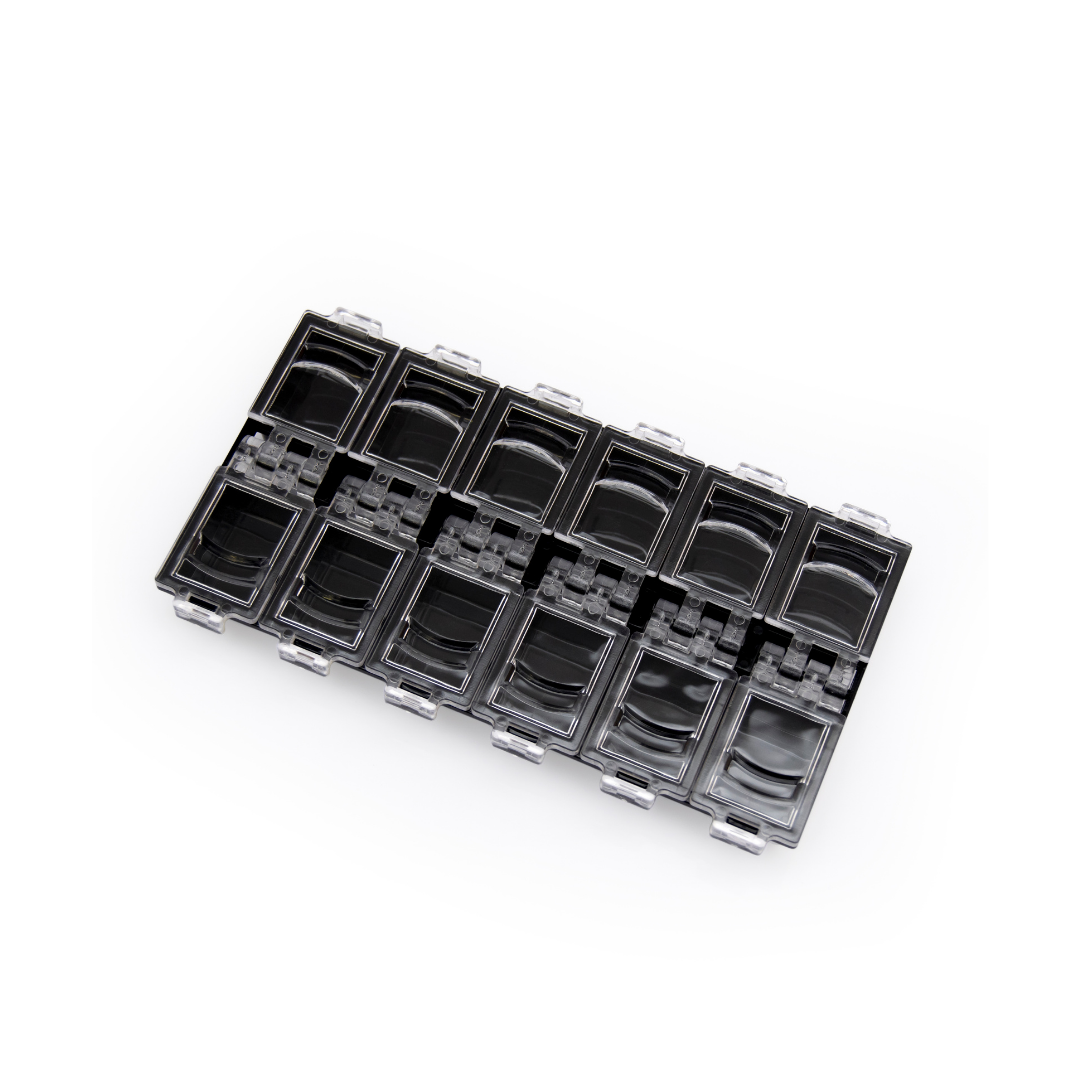 Suport de plastic negru, cu 12 compartimente pentru pietricele, strasuri si diverse ornamente de unghii.