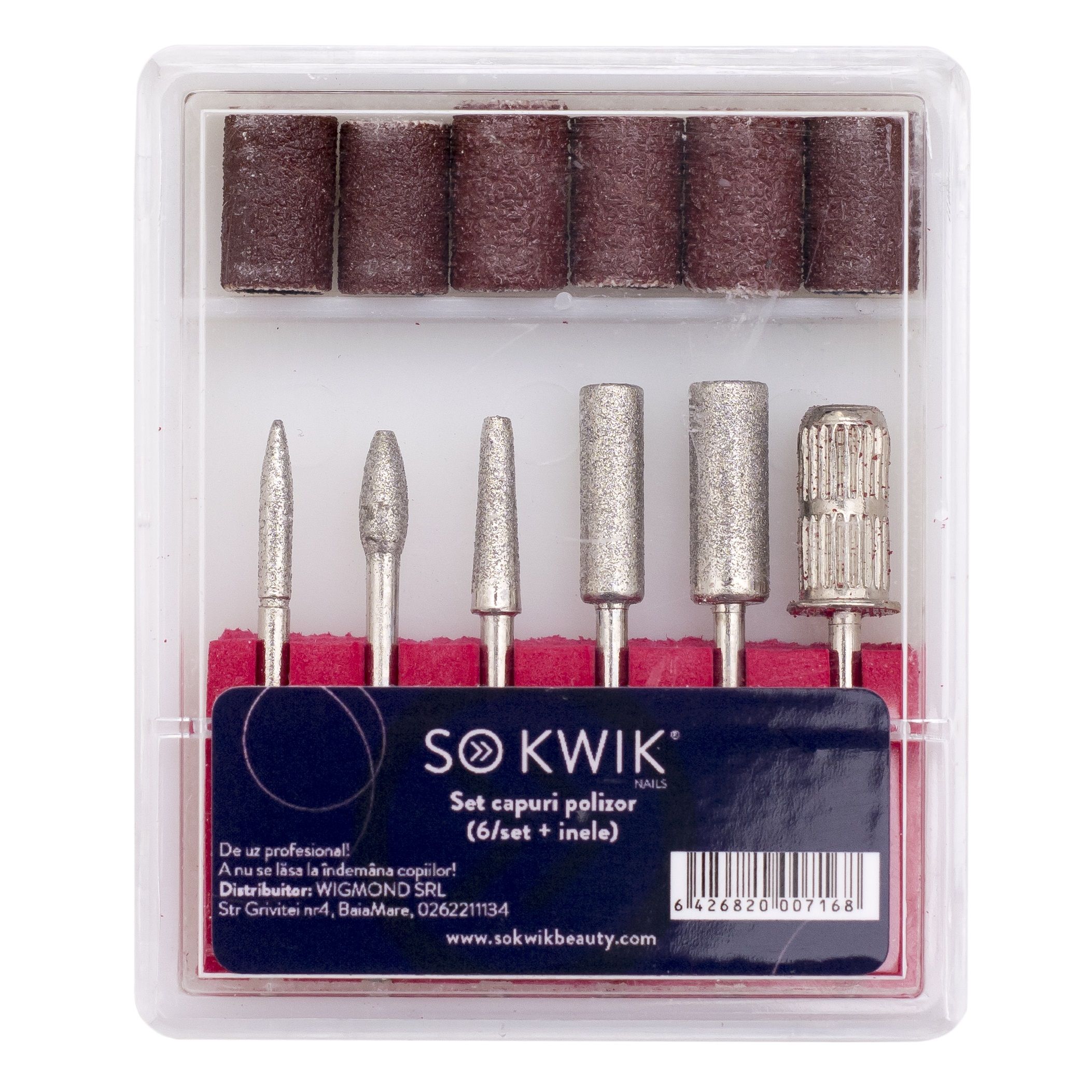 Set capete freza pentru unghii, cu 12 elemente: 5 capete de freza din carbura metalica diamantata, 1 suport inel smirghel si 6 rezerve tip inel de smirghel, cu granulatii diverse.