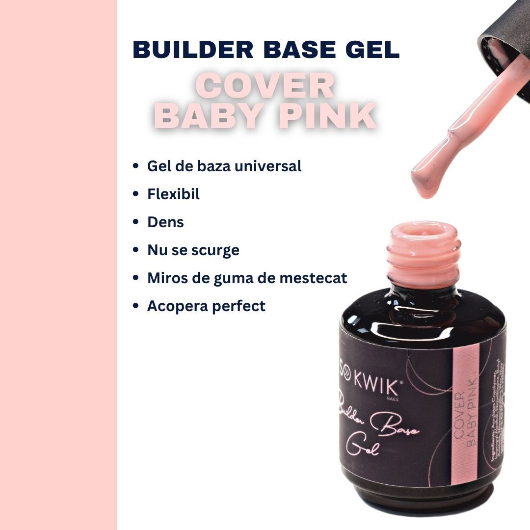 Gel de baza roz deschis , flexibil, cu aderenta exceptionala si miros senzational de bubble gum (guma de mestecat). Compozitia unica faciliteaza procesul de intarire a unghiei naturale. Builder Base Gel Baby Pink se poate folosi ca strat de baza ata pentru ojele semipermanente (sistemul Soak Off), cat si pentru gelurile UV. Textura densa, flexibila si autonivelanta permite realizarea mini-apexului in cazul manichiurii Soak Off. Fiind un gel de baza dens, nu se scurge, iar timpul de realizare a manichiurii este redus considerabil, fara a fi nevoie de finisari suplimentare a suprafetei. Builder Base Gel-urile de la SoKwik nu necesita fixare. Pigmentii de ultima generatie fac ca acest gel de baza sa acopere perfect imperfectiunile patului unghial, astfel incat se poate purta chiar si fara aplicarea unui strat de culoare peste.